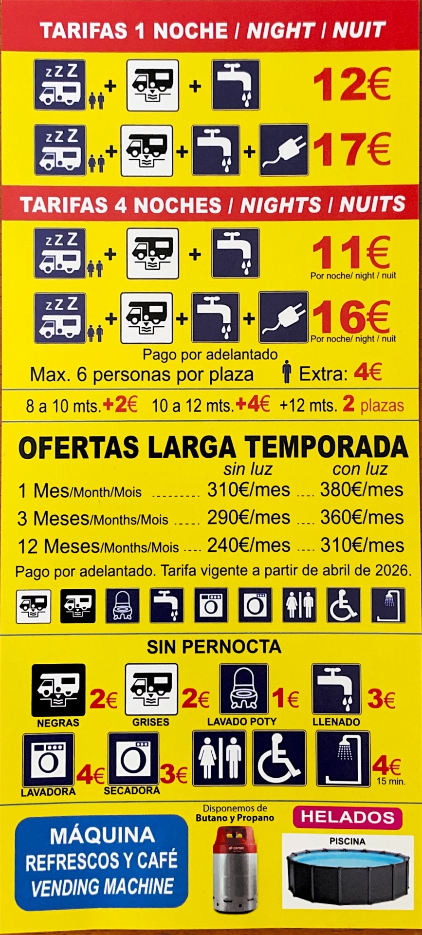 INCLUYE LA PARCELA, EL USO DE LUZ, AGUA, WIFI Y TODOS LOS SERVICIOS DEL CAMPING ,INCLUIDA LA PISCINA.
